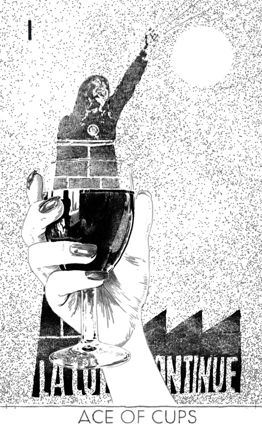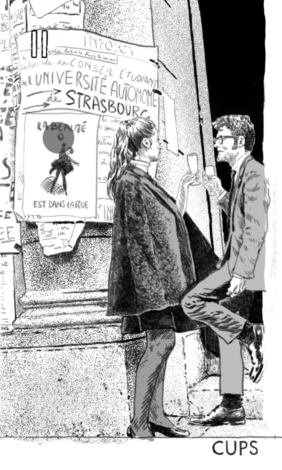 The Two of Cups show a dapper young couple, they cheers one another with champagne flutes, bubbling over on the steps of the University. They are swept up in the moment and they want to make it last. A pledge of love, or revolution. Behind them there is a build-up of plastered posters for the ongoing student revolution. “LA BEAUTÉ EST DANS LA RUE” “UNIVERSITÉ AUTONOME”. After almost a year of organizing the university had now been occupied. While this was the culmination of many forces not pictured here—this couple feels themselves distinctly at the forefront.