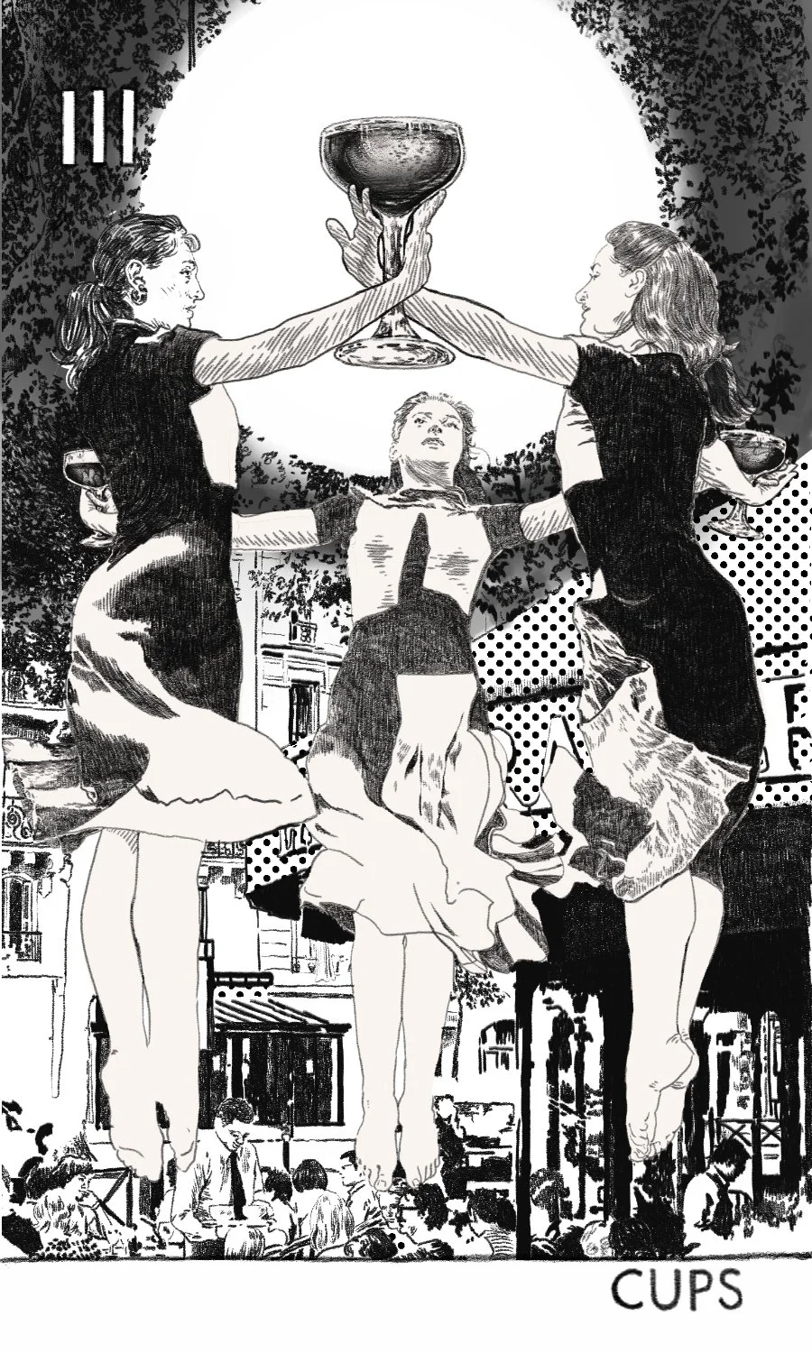 There is a radical energy in the togetherness. In the Three of Cups, these three women find a joy in one another that is transformative. This is the space that they first experiment with how they feel. This is a lived experiment in learning themselves and each other. The Three of Cups asks you to make time and space for friendship. Alienation and anomy are a given condition of life under capitalism. Life under capitalism is a drain. The social is a battery, some times we must recharge.